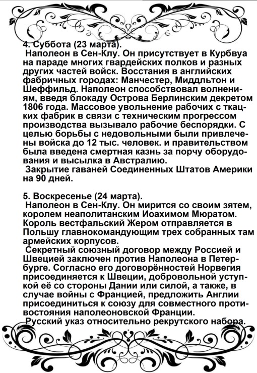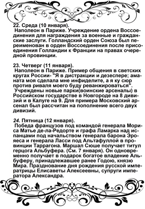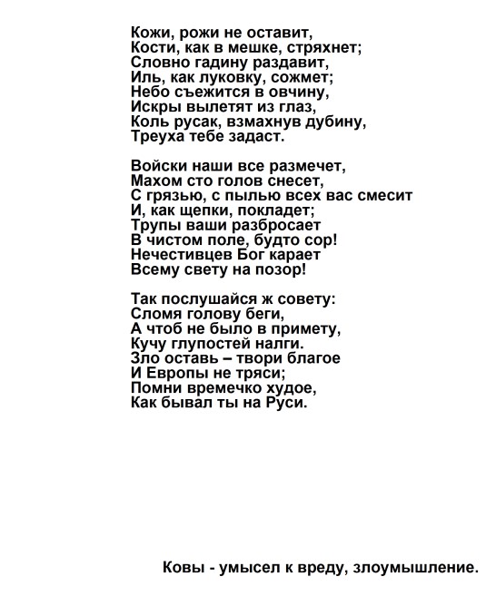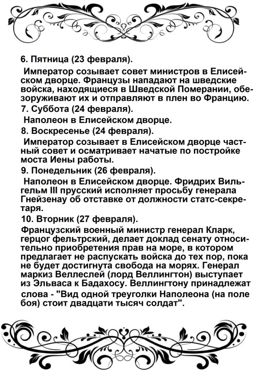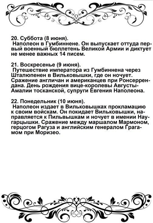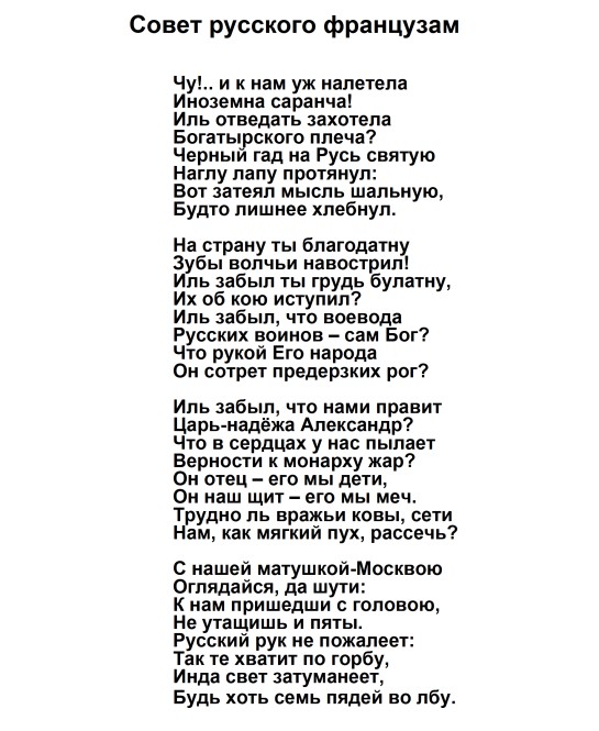 «Солдаты! Вторая польская война началась. Первая окончилась в Фридланде и в Тильзите. В Тильзите Россия поклялась быть в вечном союзе с Францией и в войне с Англией; ныне она нарушает свои клятвы!
