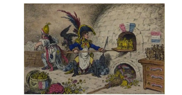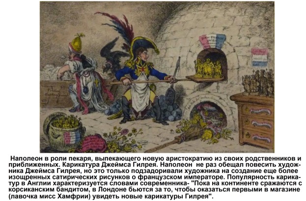 На карикатуре показан Наполеон в роли пекаря, выпекающего новую аристократию из своих родственников и приближенных. Карикатура Джеймса Гилрея. Наполеон не раз обещал повесить художника Джеймса Гилрея, но это только подзадоривало художника на создание ещё более изощренных сатирических рисунков о французском императоре. Популярность карикатур в Англии характеризуется словами современника: «Пока на континенте сражаются с корсиканским бандитом, в Лондоне бьются за то, чтобы оказаться первыми в магазине (лавочка мисс Хамфрии) и увидеть новые карикатуры Гилрея».