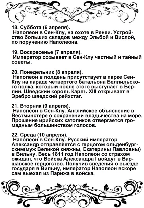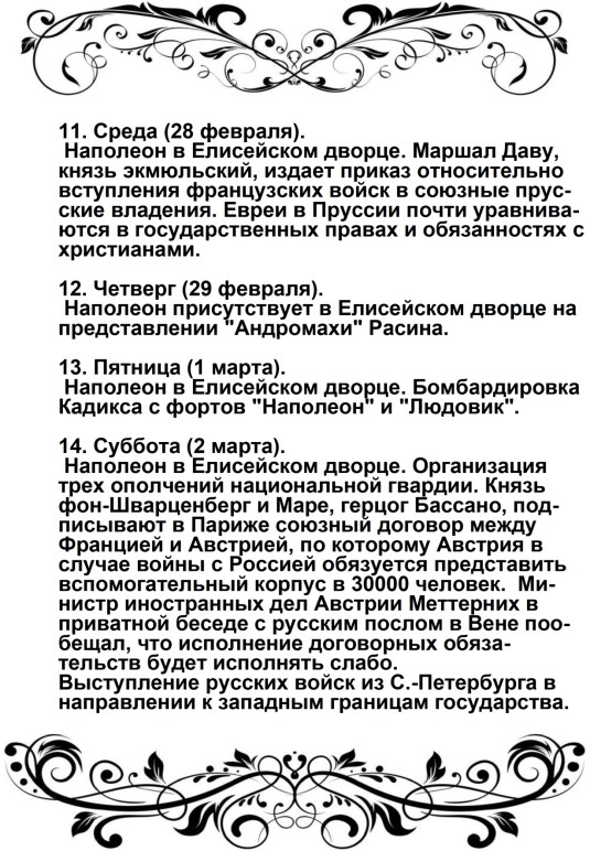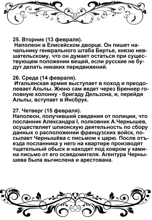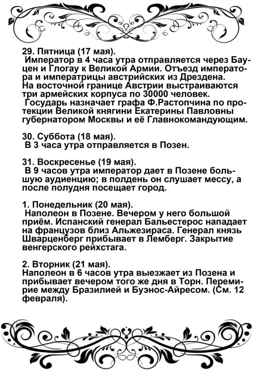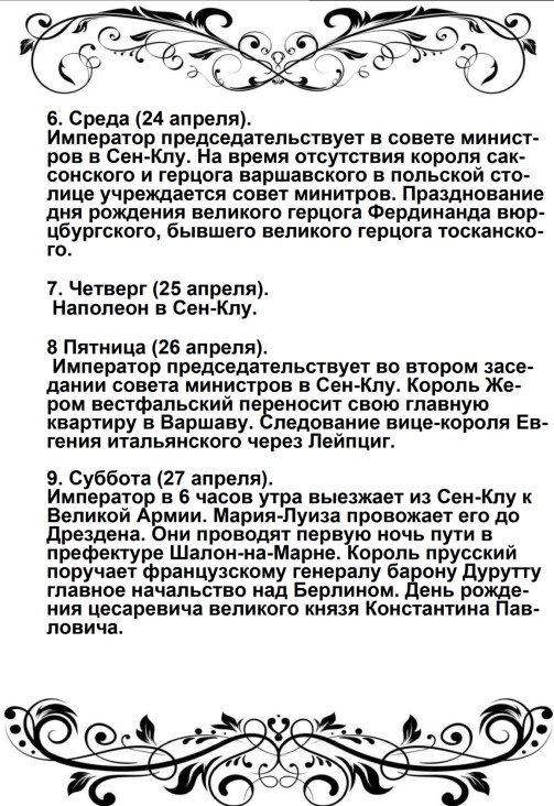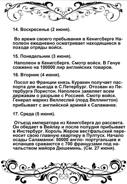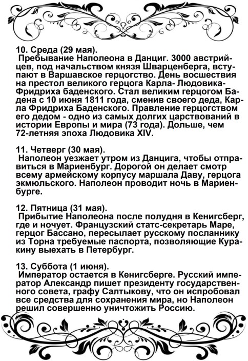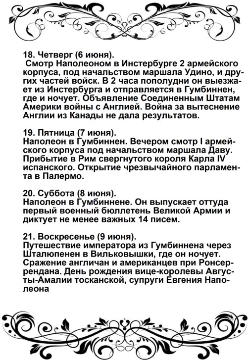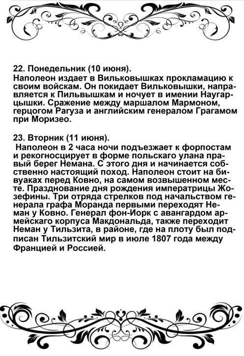 Россия увлечена роком. Судьба ее должна свершиться. Не думает ли она, что мы переродились? Или мы более уже не солдаты Аустерлица? Она постановляет нас между бесчестием и войной. Выбор не может быть сомнителен. Идем же вперед, перейдем Неман, внесем войну в ее пределы.