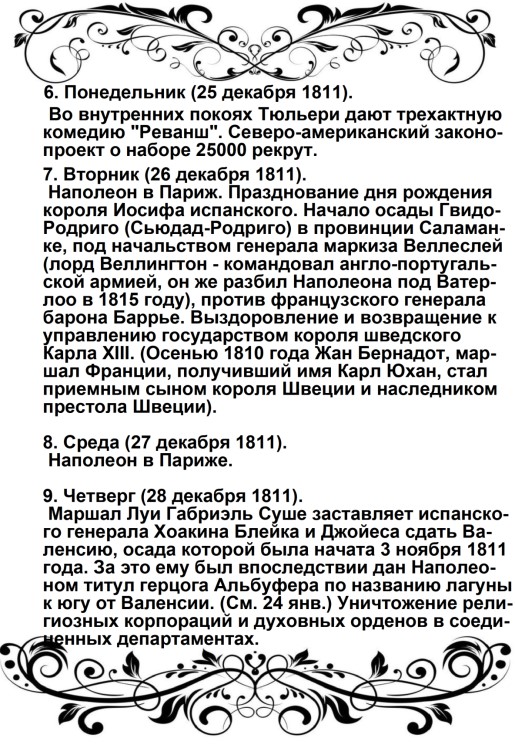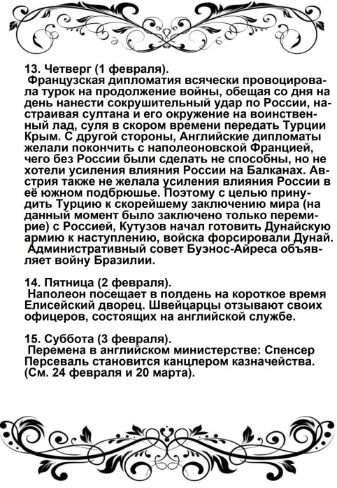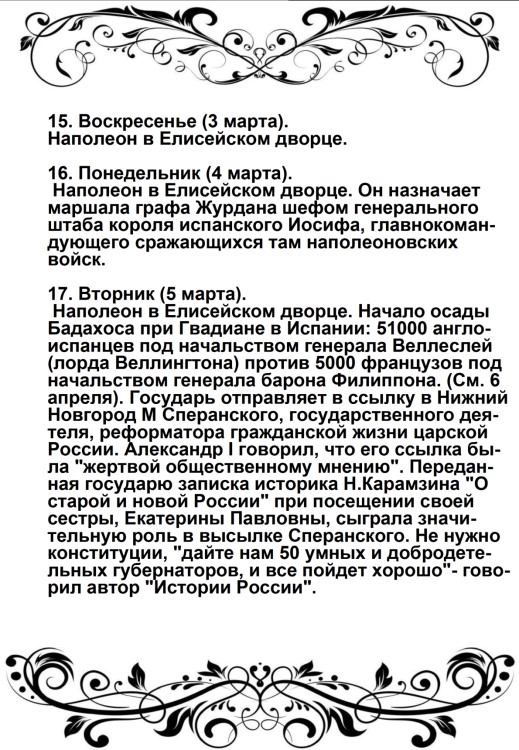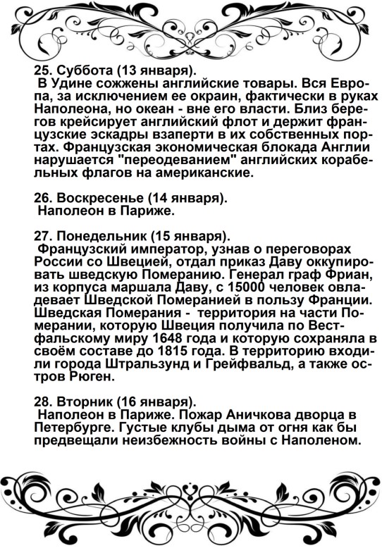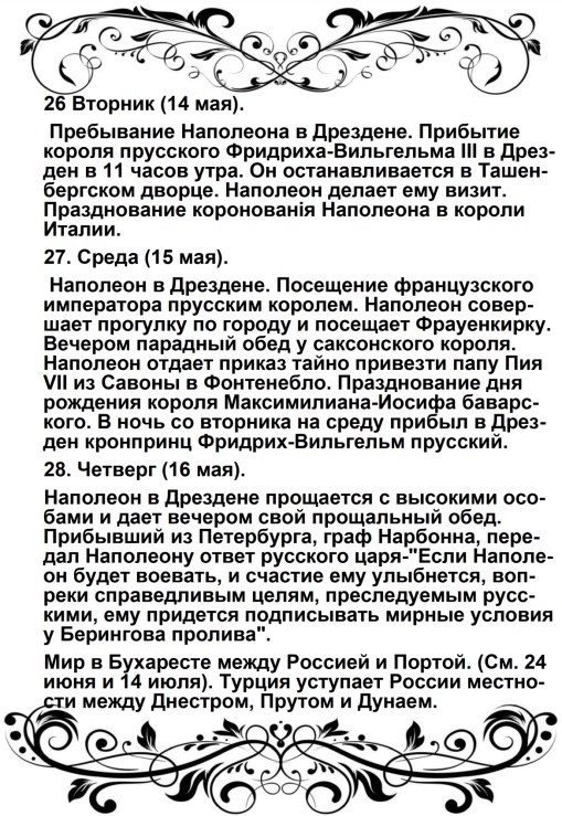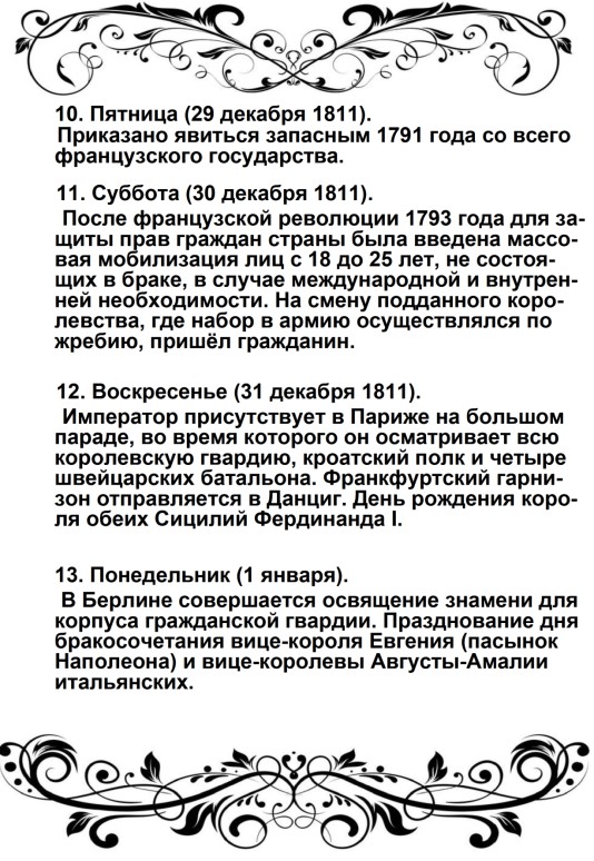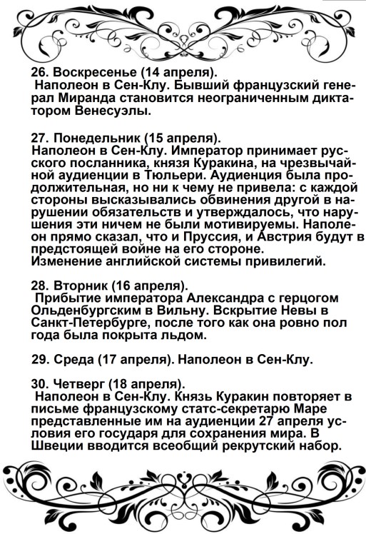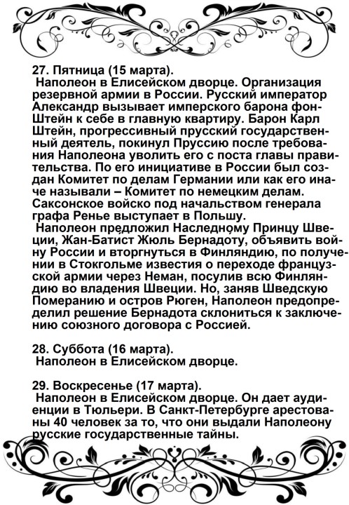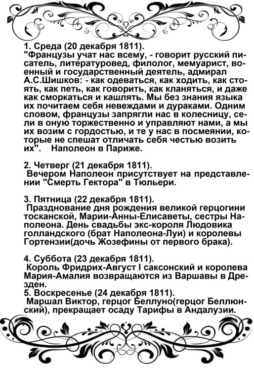 Россия увлечена роком. Судьба ее должна свершиться. Не думает ли она, что мы переродились? Или мы более уже не солдаты Аустерлица? Она постановляет нас между бесчестием и войной. Выбор не может быть сомнителен. Идем же вперед, перейдем Неман, внесем войну в ее пределы.