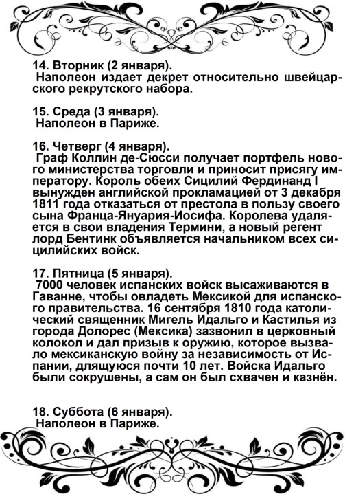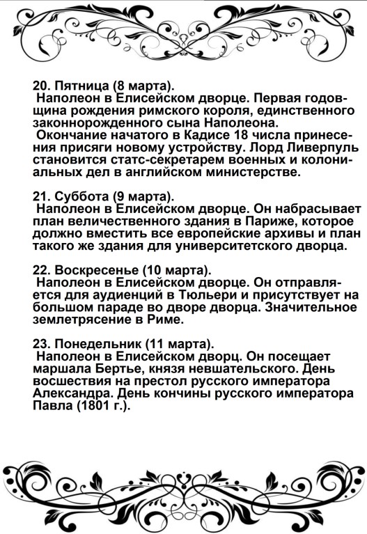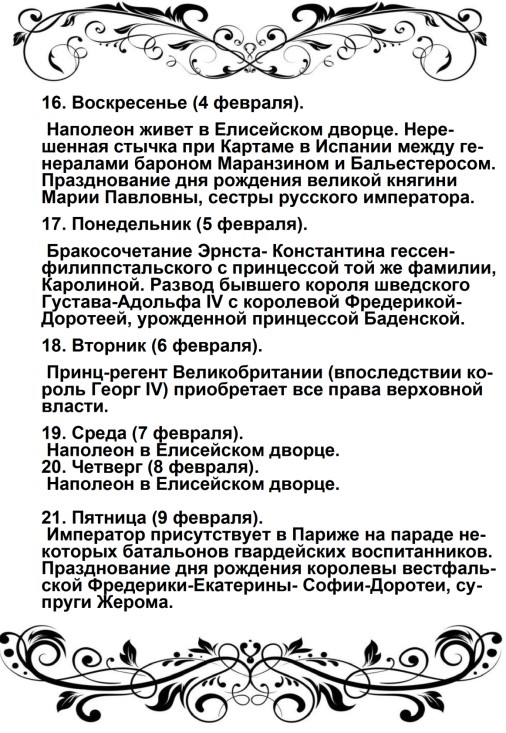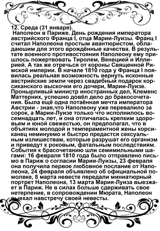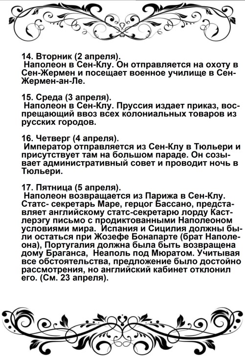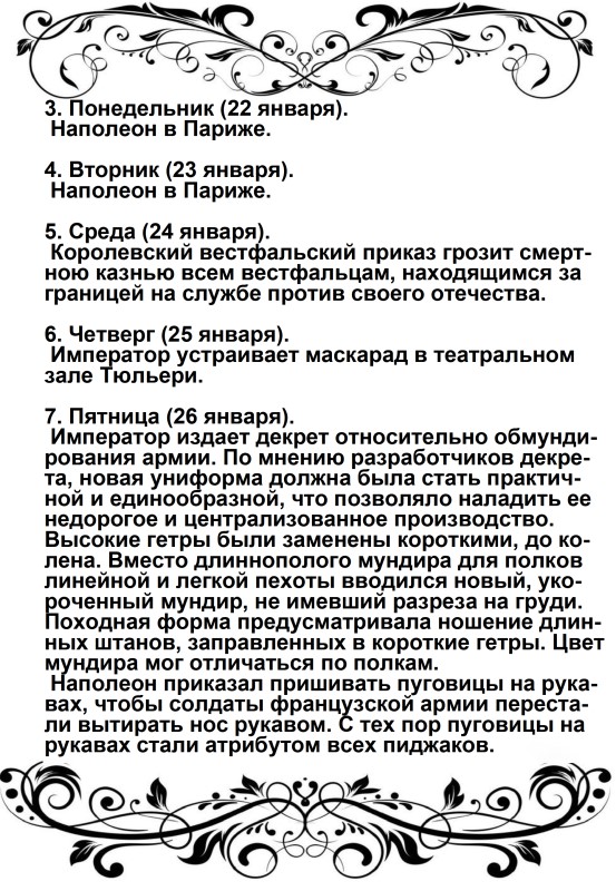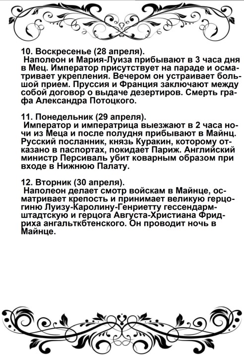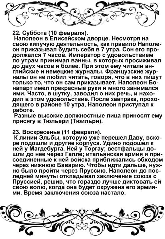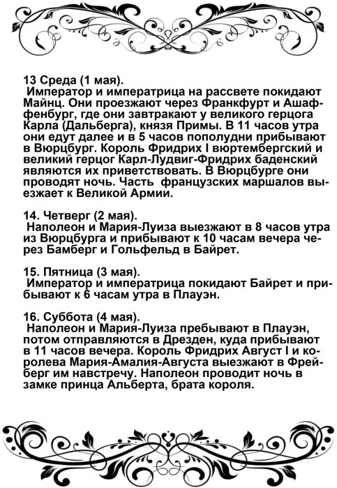 Дверца отворилась, и из кареты быстро вышел Наполеон в сопровождении герцога Иевшательского (пояснение от автора – Бертье, Луи-Александр- маршал, начальник штаба Великой армии): не было видно ни одного адъютанта, ни одного ординарца. Немного спустя, прискакал верхом генерал Брюйер (командир 1-й дивизии тяжелой кавалерии), один, без свиты. Наполеон был в своей форме гвардейского стрелка; он, по-видимому, очень устал от дороги, и черты лица его выражали заботу.