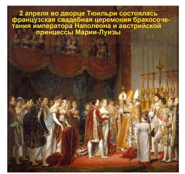 Церемония венчания состоялась во дворце Тюильри. На новой императрице было платье серебряным, расшитым жемчугом, с очень завышенной талией, согласно моды того времени. Поверх была надета императорская мантия из пунцового бархата, расшитая золотом. Длинный шлейф мантии несли четыре королевы. Четыре дамы новой императорской фамилии: Каролина Бонапарт, королева Неаполитанская, жена Мюрата; Жюли Клари, королева Испанская – жена брата Наполеона, Жозефа; Гортензия Богарне, королева Нидерландов – дочь Жозефины от первого брака, удочерена Наполеоном; Екатерина Вюртембергская, королева Вестфалии – жена брата Наполеона, Жерома.