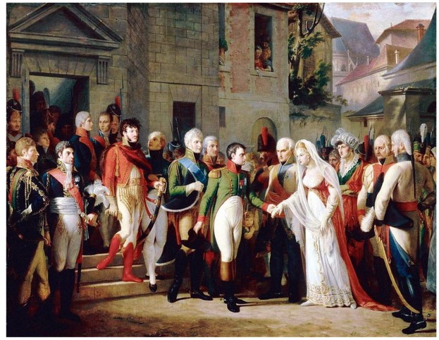 Наполеон I встречает королеву Прусскую в Тильзите 6 июля 1807 года. Слева от Наполеона стоит Александр I, между Наполеоном и Луизой – прусский король Фридрих -Вильгельм III. Это вымысел художника Жан-Шарль Тар-Дьё. Александра I не было, хотя он был неравнодушен к Луизе. Вероятно, художник поместил Александра, зная их взаимные чувства друг к другу.