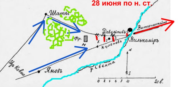 Для прикрытия главных сил 1-го корпуса и для наблюдения дорог, ведущих из Шат и Янова к Вилькомиру в Девельтово в 6 верстах от Вилькомира был расположен арьергард под командованием ген.майора Кульнева в составе двух егерских полков, четырёх эскадронов гусарского полка, трёх сотен донских казаков и 6 орудий. 16(28) июня один из разведывательных разъездов доложил о приближении крупных сил противника со стороны Шаты. Генерал Кульнев приказал выдвинуть два орудия вперёд и когда кавалерийская колонна неприятеля появилась на дороге, выйдя из леса, дал команду открыть огонь. Прозвучал первый артиллерийский выстрел в этой войне – и он был наш, русский. Неприятельские войска, не имевшие при себе артиллерии, приведены были в беспорядок и скрылись в лесу. Генерал-лейт. Уваров, командир 1-ого кавалерийского корпуса выделил Кульневу в поддержку драгунский полк. Пехотный корпус графа Витгенштейна продолжал переправу своих частей через р. Свенту в Вилькомире. В полдень противник, получив поддержку и намерение отобедать уже в Вилькомире, предпринимает атаку. Кульнев чередуя артиллерийскую кананаду и кавалерийские атаки сдерживает противника в течении двух часов. Получив информацию о завершении перехода корпуса через Свенту он отходит в Вилькомир под прикрытием атак кавалерии на открытой местности и пехоты в кустах. Затем пройдя город, успешно переходит Свенту и ружейным огнём пехоты из-за заборов уже с левого берега реки обеспечивает переход реки оставшимся частям.