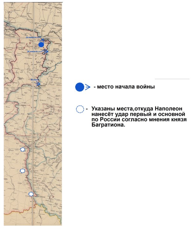 В день начала войны, князь Багратион, не зная, что она уже развязана в 4 утра Наполеоном, представляет Военному министру свои рассуждения о месте вероятного нанесения удара противником: «Я не могу думать иначе, как неприятель до сих пор делает одну лишь демонстрацию, и что его точное стремление не должно быть на те пункты, где его более ожидаем (моё дополнение- Гродно-Ковно). Его выгода непременная разделить наши силы и он, по мнению моему, будет стараться воспользоваться сим, как имел честь докладывать выше, у Устилуга, Влодавы и Бреста. … Неприятель не может не видеть, что при действительном впадении его в границы наши, чем он ближе будет к морю, тем более рискует быть отрезанным и истребленным. Из чего заключить следует, что сосредоточие сил неприятельских между Гродно и Ковно есть не что иное, как желание отвлечь наши силы от пунктов настоящих его стремлений».