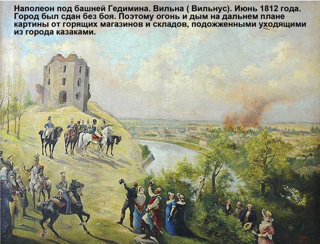 Особенное внимание Наполеона при въёзде в Вильну привлекла Замковая гора ( изображена на рисунке выше по тексту). Несмотря на крутой подъем, он быстро взобрался на лошади на её вершину и около четверти часа любовался городом с того места, где четыре столетия тому назад основатель города Гедимин следил за движениями крестоносцев, угрожавших неожиданным нападением на Вильну.