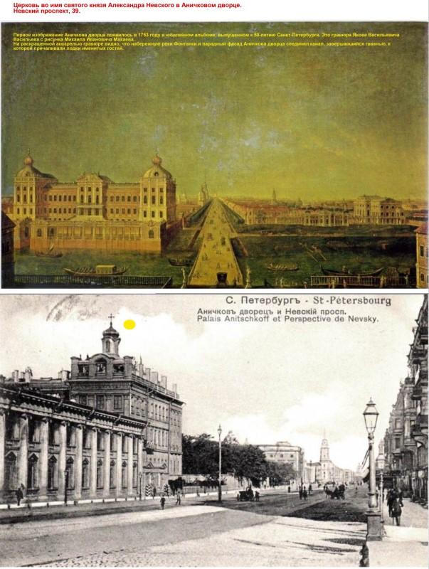 Первоначально церковь размещалась в северном флигеле дворца, выходящем на Невский пр., и занимала двусветный объем. Флигель венчал традиционный для русского барокко золоченый купол с луковичной главкой, прорезанный круглыми окнами-люкарнами и украшенный рельефными орнаментами. Отделан храм был по проекту арх. Ф. Б. Растрелли в духе барокко. Трехъярусный резной иконостас по рисунку Растрелли оформил золоченой резьбой мастер И.Ф. Дункер, образа написаны художниками И. Я. Вишняковым, А. П. Антроповым, И. И. Бельским и др. Освящение храма во имя Воскресения Христова состоялось 1 августа 1751 г. в присутствии императрицы Елизаветы Петровны.
