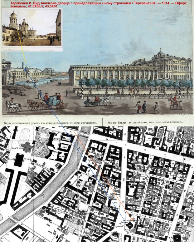 Весной 1816 года К. Росси получает от Бетанкура предложение реконструировать усадьбу Аничкова дворца. Росси перепланировал некоторые интерьеры дворца и пристроил с юга дугообразный «сервизный корпус». Также Росси разработал около двадцати вариантов генерального плана преобразования усадьбы Аничкова дворца[3]. Однако Александр I утвердил проект представленный А. Модюи. Модюи включил дворец с прилегающим садом в ансамбль площади Александринского театра (ныне площадь Островского): он соорудил ограду вокруг дворцового сада и спроектировал на его западной стороне два одноэтажных павильона [4].