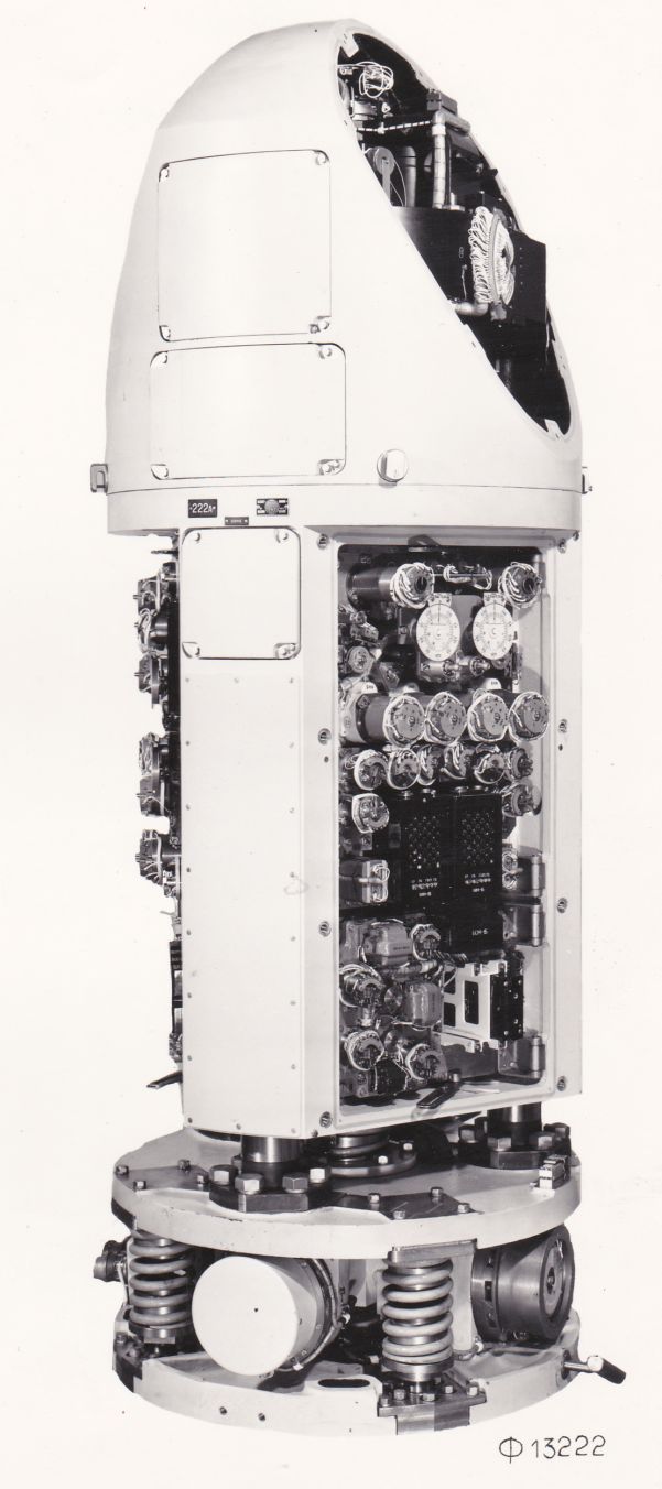 Нижняя часть прибора содержит оригинальный амортизатор, защищающий верхнюю часть прибора от интенсивного удара с ускорением до 1000 g и перемещениями основания прибора при ударе до 60 мм. Цилиндрическая форма прибора и его размеры обусловлены диаметром люка подводной лодки.
