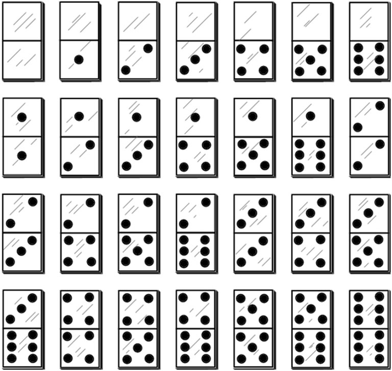 Обычный европейский набор для игры в домино содержит 28 фишек. Лицевая сторона каждой фишки или камня, или костяшки, или кости, как их по-разному называют, разделена на два квадратика с числом очков от нуля до шести в различных сочетаниях, нанесенных в виде точек. Из этих 56 квадратиков восемь «пустых», восемь содержат 1 очко, восемь – 2 очка и так далее.
