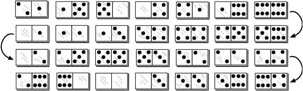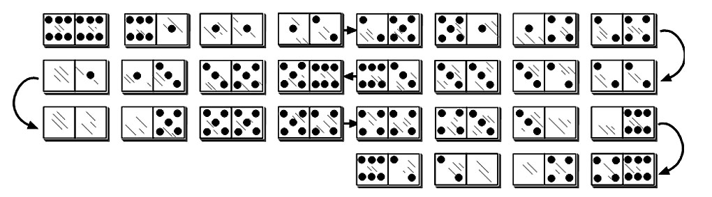 Начнем с разминки: выложите цепочку из полного комплекта косточек домино, соблюдая правило игры и ведя выкладку только в одном направлении. Начать можете с любой кости. Пустяковая задача, скажете вы? Действительно, это легко сделать, ведь существует огромное количество возможных вариантов выкладки цепочки из 28 косточек домино. Не найти один из них просто невозможно.