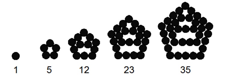 Вернемся к правильным многоугольникам. На очереди пятиугольные числа: 1, 5, 12, 22, 35, 51, 70, 92, 117, 145, 176, 210, … .