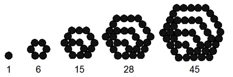 Можно было бы продолжать бесконечно, рассматривая прочие многоугольные плоские фигурные числа, но нужно где-то остановиться. Пусть это будут шестиугольные числа.