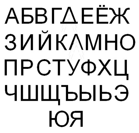 Рисунок показывает, что той или иной симметрией обладают 20 букв из тридцати трех, и только 13 букв асимметричны.