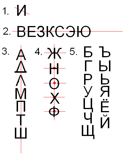 Рассмотрев предложенный шрифт, можно разделить все буквы на пять различных групп симметрии: