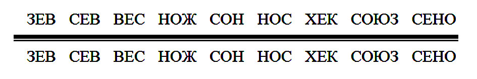 – относительно горизонтальной оси симметричными будут слова, состоящие из букв В, Е, З, К, С, Э, Ю, Ж, Н, О, Х, Ф;
