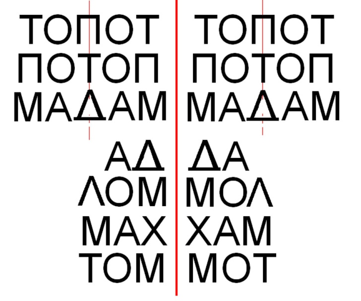 – относительно вертикальной оси могут быть симметричны слова, состоящие из букв: А, Д, Л, М, П, Т, Ш, Ж, Н, О, Х, Ф.