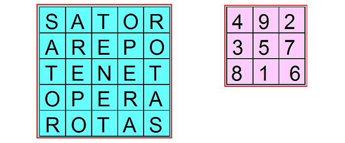 Палиндромы известны во многих языках (например, gig(кабриолет), eve(канун), level(уровень) – в английском), а их история восходит к временам незапамятным. Древнейший из сохранившихся палиндромов написан по-латыни и возник, насколько известно, в IV веке нашей эры. Это фраза «Sator Arepo tenet opera rotas». Перевод, естественно, палиндромом не является: «Сеятель Арепо с трудом держит колеса». Обычно этот палиндром, состоящий из пяти пятибуквенных слов, записывали в клетках квадрата. Необычные свойства этого квадрата заставляли приписывать ему магическую силу, и в этом просматривается параллель с математическими магическими квадратами. И те, и другие квадраты, вырезанные на пластинках из благородных металлов, носили в качестве амулетов, защищающих от болезней и злых духов; их изображения высекались на стенах храмов и дворцов. Ритуальное значение квадратов обуславливалось «дьявольской» сложностью их образования и темнотой малообразованных людей того времени.