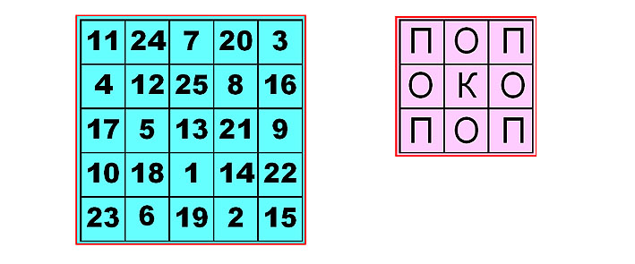 В квадрате с палиндромом его можно прочитать четырьмя способами: по строчкам слева направо и сверху вниз, по строчкам справа налево и снизу вверх, плюс два аналогичных способа по столбцам. Сейчас таким палиндромам, записанным в виде квадратной таблицы и допускающим прочтение четырьмя способами дали название – суперпалиндром. Для квадрата 3×3 известен суперпалиндром Мир или Рим. В математическом магическом квадрате сумма трех чисел по трем строчкам, трем столбцам и двум диагоналям получается одинаковая, равная 15. Как здесь не удивляться, если в хаосе всевозможных размещений букв или цифр, вдруг получается такая гармония. Теперь следите за развитием мысли, мы можем сделать квадрат из букв размером 3×3, а квадрат из цифр размером 5×5.