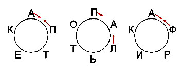 Эти примеры составил математик А.В. Болтрукевич. Если читать их в направлении по стрелке от указанной буквы, то можно прочитать слова аптека и пакет, пальто и лапоть, Африка и факир.