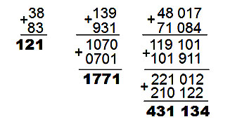 Иногда для достижения симметричного результата приходится делать большое число шагов, например, для числа 89 ожидаемый результат получается только после 24-го шага. Существует ли число, которое никогда не приведет к симметричному результату? Это никем еще не доказано! Наименьшее число, с которым еще не ясно – это 196. Математики на компьютерах проделали сотни тысяч шагов, но получить палиндром так и не удалось, хотя никем не доказано, что он никогда не появится [??]. Теперь осуществим переход к математическим предложениям палиндромам, есть ведь и такие в богатом мире математики. Для этого нужно использовать математические действия. Начнем со сложения.