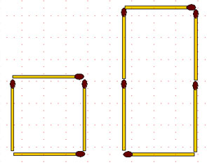 Соотношение площадей фигур 1:3. Теперь возьмите 1 спичку в большей группе, переложите её в меньшую, и постройте новые фигуры с тем же соотношением площадей. Только сделайте это так, чтобы 12 спичек из первоначального расположения остались на своих местах.