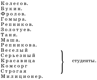 В небольшой комнате вынесены кровати, сдвинуты столы. Свадебный ужин. Букин и Маша (жених и невеста), Фролов. Из гостей неумеренной непосредственностью выделяется однокурсник Букина по прозвищу Гомыра. Прочих, сидящих за столом, удобно назвать так: Комсорг, Веселый, Серьезный, Красавица. Разгар веселья.Комсорг. Товарищи! Внимание, товарищи…