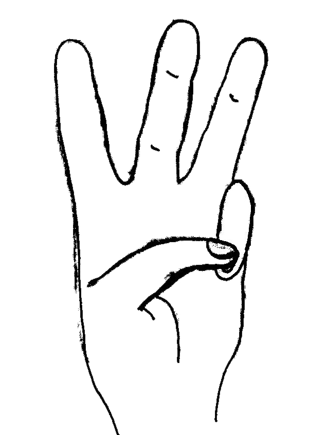 «Вилка» – мизинец прижат большим пальцем к ладони. Остальные пальцы смотрят вверх.