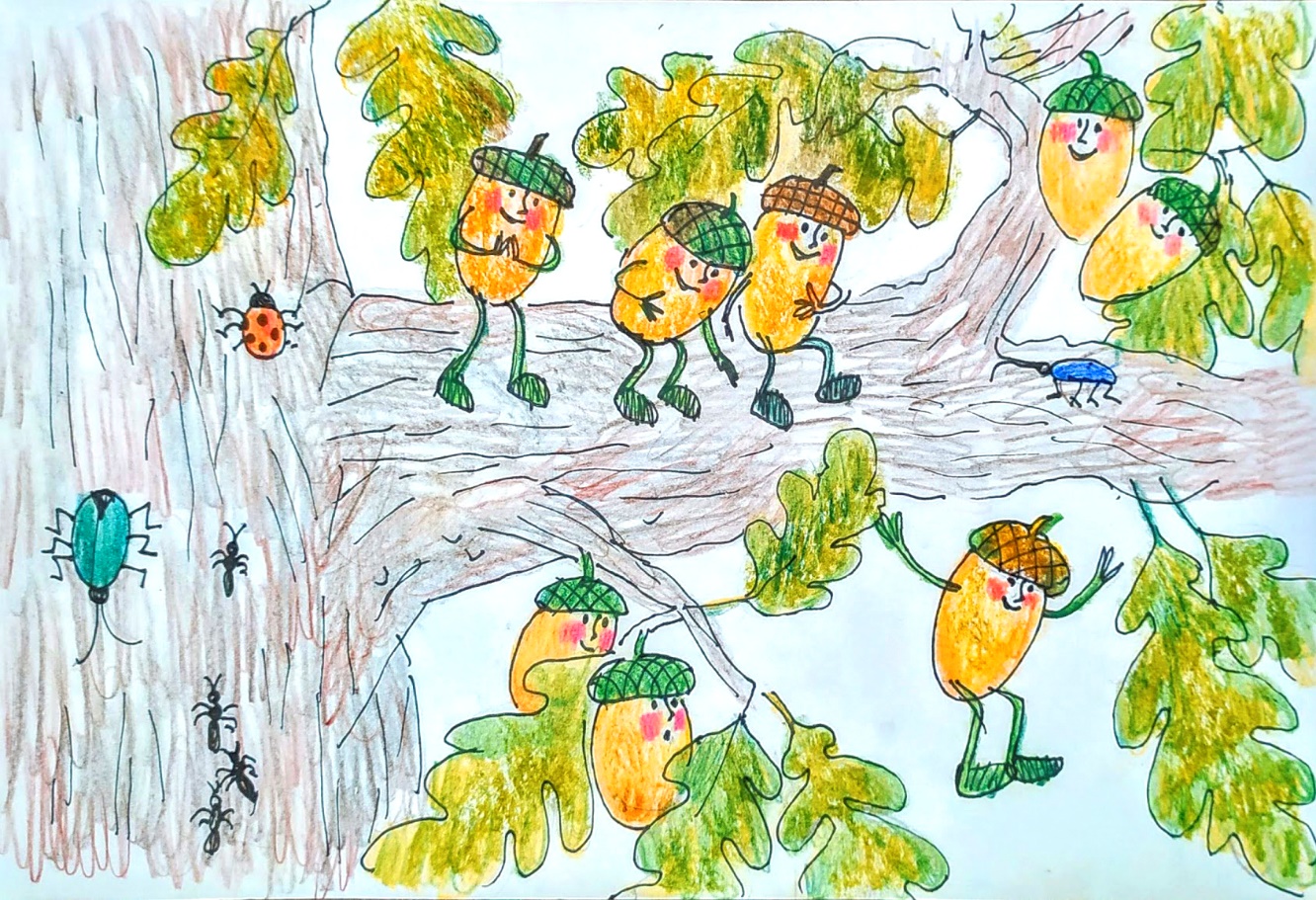 В конце концов, листок приземлился рядом с большим дубом. Проказники-желуди тут же начали весело переговариваться: