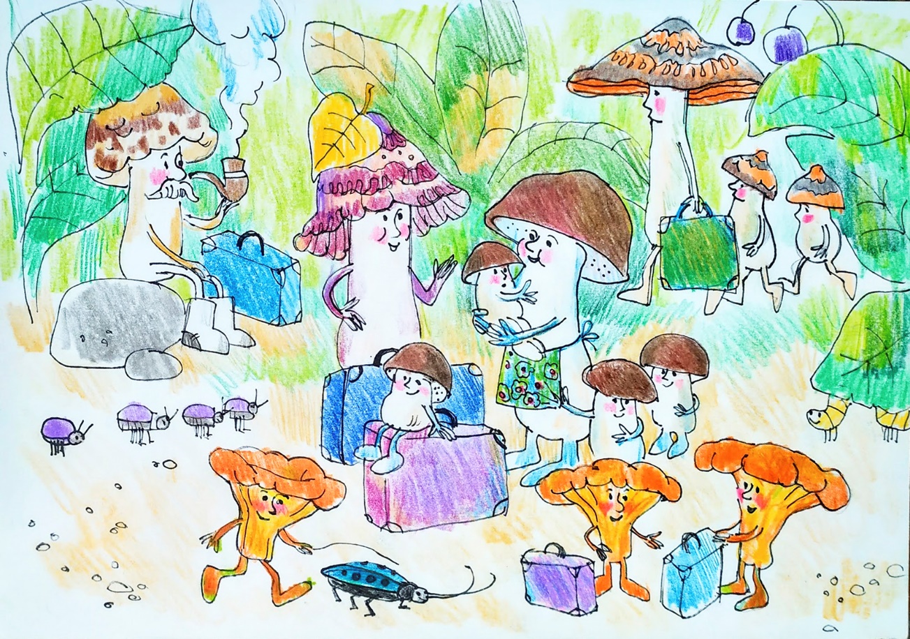 – Привет! Привет! – выглянули из травы маленькие грибочки. Их шляпки были самых разных цветов: желтые, фиолетовые, красные.