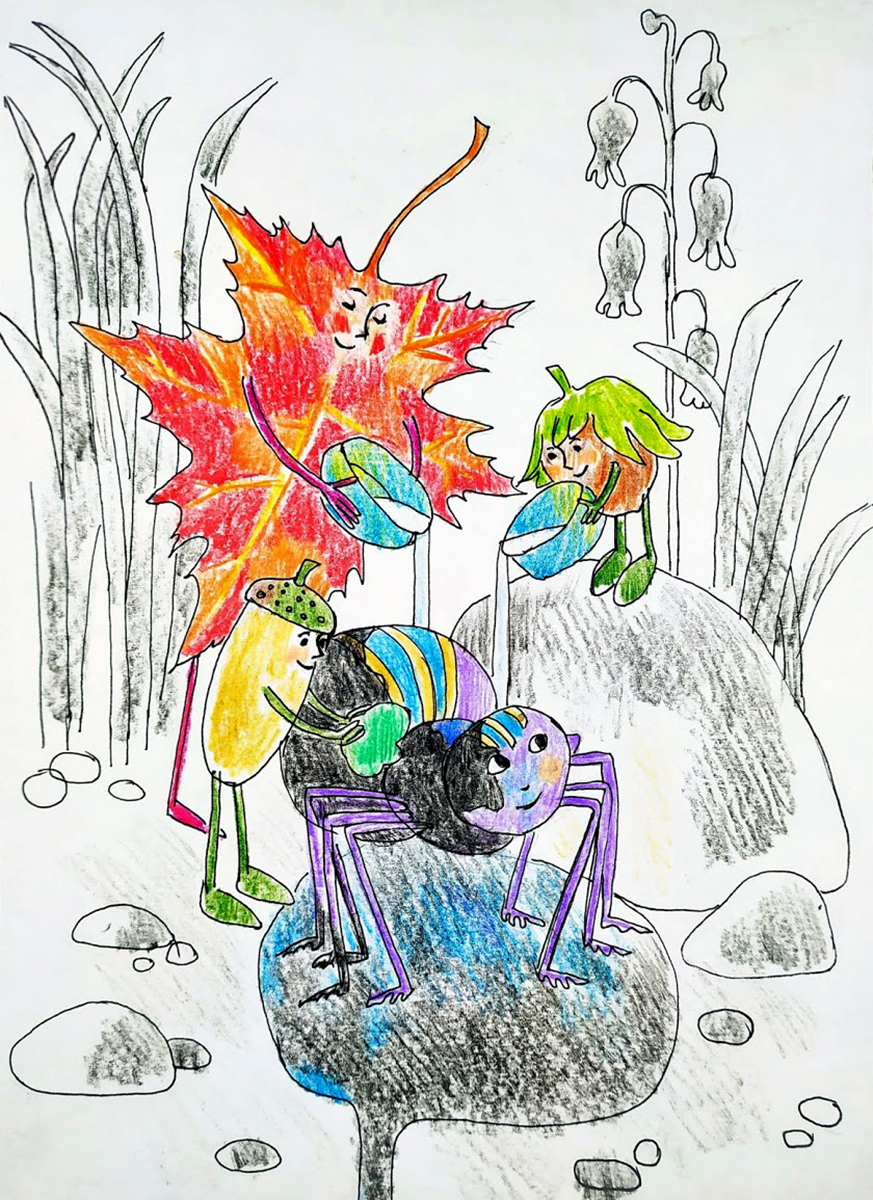 Среди букашек оказался жук-точильщик, он быстро выточил из куска коры маленькое колесико. Желудь и орешек принесли палочки и сухие травинки. Вместе они смастерили тележку. Не «вело-ци-пед», конечно, зато получится разместить малышей. Все были поражены и громко аплодировали приятелям. Затем главный гриб выстроил всех в ряд и скомандовал отправляться в путь.