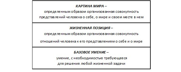 Итак, человек как-то представляет себе окружающий мир, чего-то в нем хочет и какими-то способами пытается желаемого добиться. То, как человек представляет себе окружающий мир, мы обозначили понятием картины мира; то, на основе чего он выбирает желаемое – понятием жизненной позиции; то, какими способами он этого добивается – понятием базовых умений.