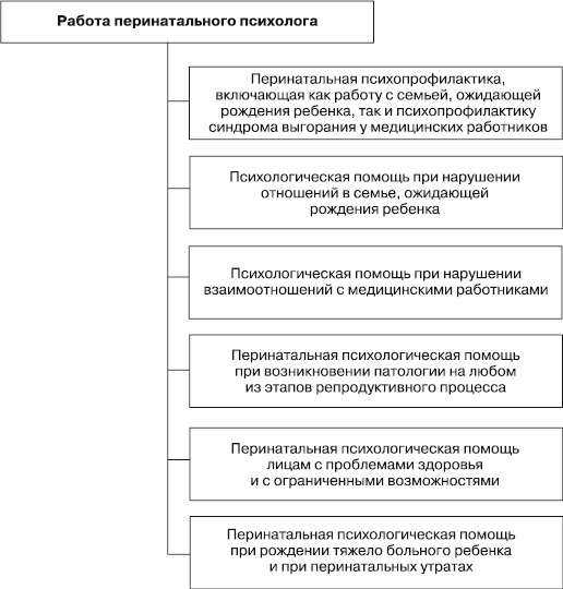 Определение перинатальной психологии отражает ее основные разделы, отличающиеся задачами, встающими перед психологом на разных этапах репродуктивного процесса (рис. 4).