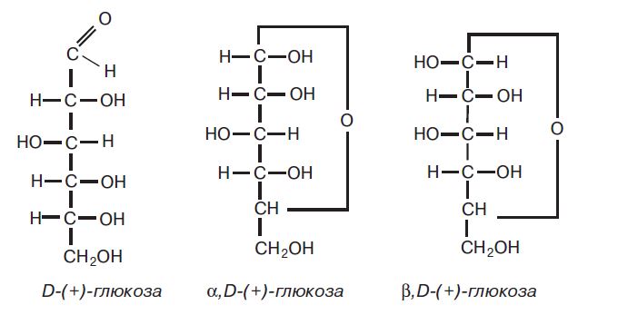 Кроме того, переход альдегидной формы глюкозы в циклическую полуацетальную сопровождается появлением пятого асимметрического атома углерода и двух оптических изомеров: (полуацетальный, гликозидный, гидроксил справа, а атом водорода слева) и (гликозидный гидроксил слева, а атом водорода справа):