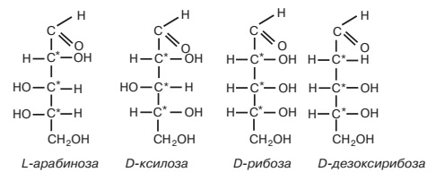Молекулы моносахаридов содержат атомы асимметрического углерода. Это атомы углерода, четыре валентности которых насыщены разными радикалами (атомами или группами атомов). Наличие таких атомов в молекуле создает возможность существования двух видов изомеров каждого соединения, причем одно является зеркальным отражением другого. Символы D и L указывают на положение групп Н и ОН при предпоследнем углероде, независимо от того, в какую сторону раствор данного вещества вращает плоскость поляризации. Растворы веществ, содержащих в молекуле асимметрический углерод, обладают свойством вращать плоскость поляризованного света, они оптически активны. Поляризованным светом называется свет, в котором колебания, перпендикулярные ходу светового луча, происходят в одной плоскости. Изомеры, вращающие плоскость поляризации вправо, называются правовращающими (символ +), поворачивающие влево – левовращающими (-). Направление поворота определяется наблюдателем, на которого падает луч. Смесь изомеров L и D равной концентрации растворов дает оптически пассивный раствор (рацемат). Если в молекуле находятся два асимметрических углерода (один правовращающий, а другой левовращающий), связанные с одинаковыми радикалами, соединение будет оптически пассивно. При наличии нескольких асимметрических атомов в молекуле знак вращения плоскости поляризованного света может не совпадать с названием ряда; например, природная β-фруктоза принадлежит к D-ряду, но ей присуще левое вращение, поэтому ее называют еще левулезой (А. Т. Пилипенко и соавт., 1985).