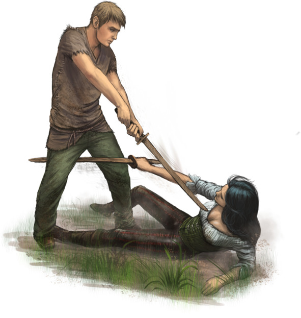 Заметив это, Байн повернулся к нему лицом и ловко отпарировал несколько бойких выпадов и ударов Макса. Ловко провернув петлю своим мечем, он ударил парнишку локтем в солнечное сплетение, подрубил его мечом под колено, и нанёс несколько новых ударов по спине. От боли у Макса всё поплыло перед глазами. Он упал, но снова встал на одно колено, опираясь на меч.