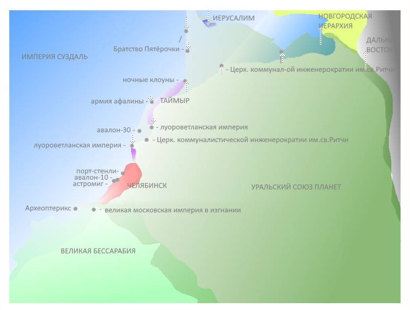 Уральский Союз Планет – государство Рукава. Второе [1] по величине государственное образование Сектора, включающее в себя пятнадцать звёздных систем с терраформированными планетами и спутниками и ещё двести тысяч «пустых» звёзд и звёзд с купольными поселениями на планетах. Кластеры молодого государства колонизировались начиная с 2350-х годов Московской Империей и Великим Казахстаном. Государство, подписавшее Московский Транспортный Протокол. Граничит с Суздальской Империей (к условному западу и северу), Бессарабией (на условном юге), Свободным Челябинском, Иерусалимской Республикой, Таймырским Царством (север, анклавы и эксклавы) и Дальним Востоком (на востоке). (…) Многие политологи рассматривают нынешний УСП как протекторат или совокупность окраинных колоний Суздальской Империи [источник?]1. Крупнейшие городские системы: Новоуральск (2,9 млд) – официальная столица, Пермь Великая (4 млд, Пермь Малая в той же системе – 0,12 млд) Уфа и Стерлитамак (2,2 млд), Сургут (1,8 млд), Исеть (1,5 млд), Обь (1,2 млд), Кыштым (0,9 млд), Тюмень (0,1 млд) 2. Союзный флот: 15 больших летающих космодромов, 85 тяжелых крейсеров, 800 крейсеров, 31000 эсминцев/фрегатов, 0,1 млн. истребителей и штурмовиков и 11 орбитальных заводов. Совокупный флот членов автономий – 16000 эсминцев/фрегатов, 1,3 млн. истребителей (крупные военные суда автономиям держать запрещено согласно приложению к Московскому Транспортному Протоколу [2]). Во офицерской иерархии 150 млн. человек, во флотах автономий – 80 млн. человек. 3. Политическое деление (…)