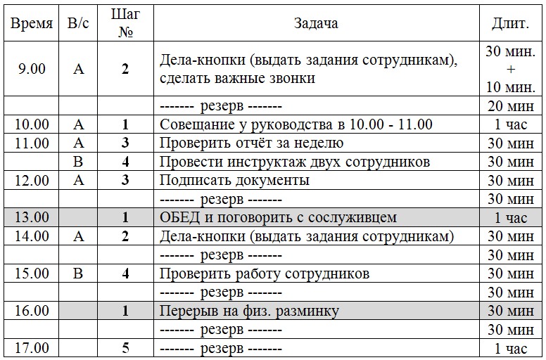 Итак, если Вы раньше не составляли распорядок дня, то сейчас видите, что его можно представить в виде нескольких крупных дел, промежутки между которыми заполнены небольшими делами или блоками с короткими делами.