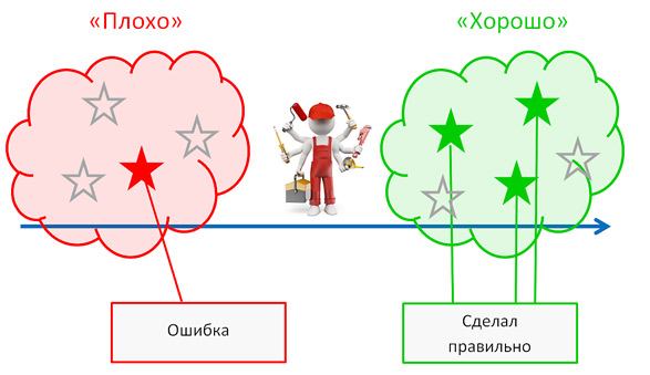 А теперь посмотрим, что происходит с руководителем, который попался в ловушку «Молчание – знак согласия», т.е. он не обращает внимание на то, что сделано правильно, но замечает ошибки. Что в результате: