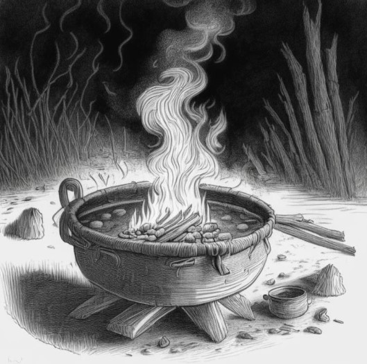 В стороне от огня стоял старый котелок, чудом доживший до наших дней без единой дырки. Внутри все еще побулькивала густая жижа. Отшельник поднял с одного из пеньков деревянную миску, такой же ковшик и зачерпнул еды.