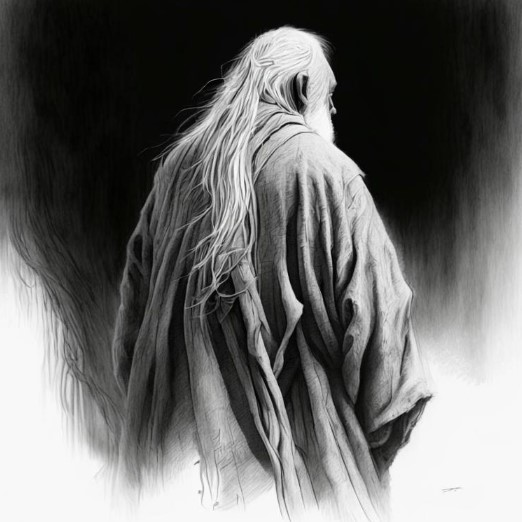 По итогу я лишь таращился на несуразный домик до тех пор, пока из-за него не показался старик в грязном балахоне. На лицо его спадали длинные седые волосы. Почти такой же длины борода ему совсем не мешалась.