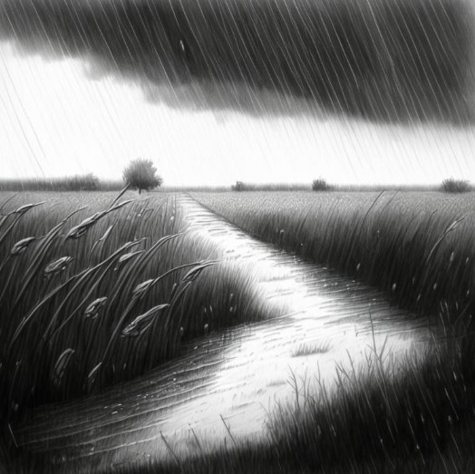 Но резкий порыв ветра лишил меня надежды вернуться домой сухим. Вместе с ветром дождь накрыл сплошной стеной и начал гонять волны по полю, сгибая мягкую июньскую траву.