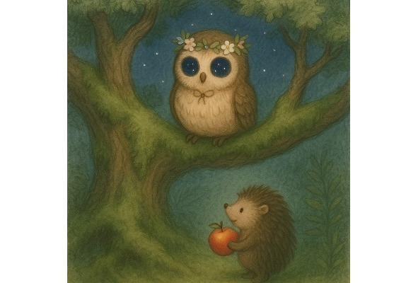 Когда-то очень давно Совушка ослепла. Она не могла видеть, а только воспринимала мир на слух – он говорил с ней шорохами и дыханием ветра. В огромных тёмно-синих глазах птицы мерцали белые искорки. И те, кто заглядывал в её глаза, видел бездонное ночное небо, полное звёзд. Каждый день к ней в гости приходил Ёжик Жан-Колючка. Ему нравилось разгадывать Совушкины загадки и делиться мыслями, которые посещали его, пока он изучал тайны окружавшего их леса. Часто они засиживались до самого вечера, сочиняя вместе очередную сказку для лесных обитателей.