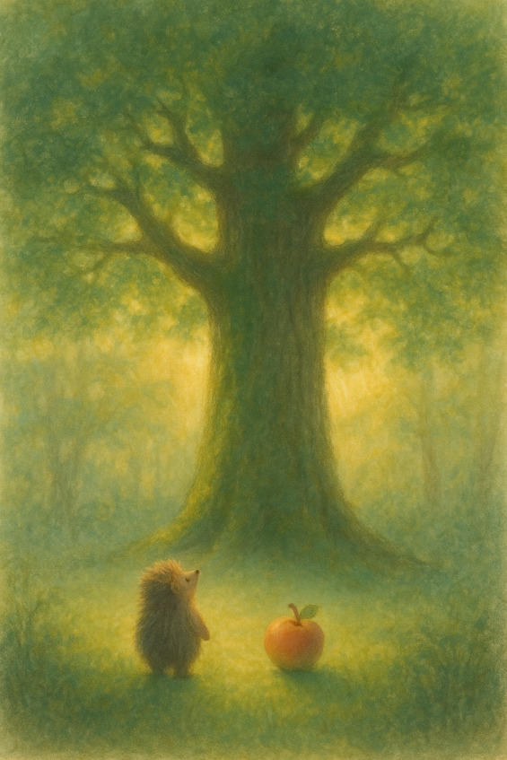 Смех доносился из густой травы неподалёку. Ёжик осторожно подошёл ближе и увидел яблоко. Оно переливалось яркими красками и, смеясь и перекатываясь в траве, играло с солнечными лучами.