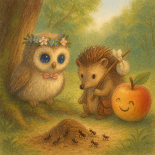 Ёжик склонился к подножию дуба, где сновали муравьи и мельтешили букашки. Жизнь у них кипела без остановки. Чёткий строй маленьких трудяг перетаскивал веточки, крошки и семена, прокладывая меж корней тонкие тропки.