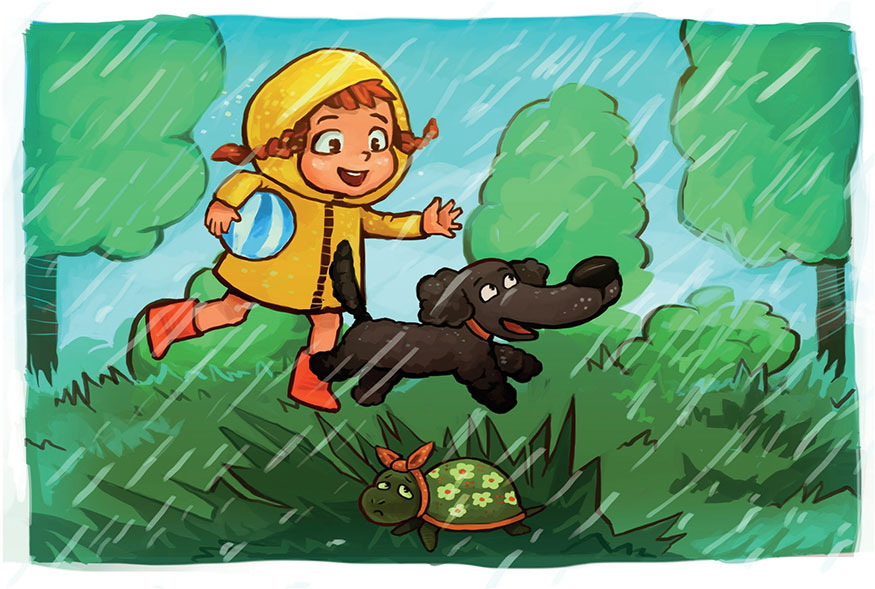 Ветерок описал вокруг меня несколько кругов, отчего опавшие листочки тоже закружились в танце. Мне стало весело, и я стал кружиться вместе с ними. Мячик мирно лежал под скамейкой, он не хотел попадать под дождь и мокнуть. Ирочка присела на корточки и выпустила Нюшу в траву. Черепаха выставила из панциря свои лапки, голову и хвостик. Нюша медленно водила головой из стороны в сторону, прислушивалась и принюхивалась. Она освоилась и начала также медленно продвигаться сквозь траву. Мне не терпелось побегать и поиграть с ней. Я то убегал и звал её за собой, то прибегал к ней снова, торопил и подталкивал носом. Нюша была явно недовольна, но сказать она ничего не успела, потому что внезапно начался дождик. Шумный, быстрый, весёлый. Именно такой товарищ по играм и был мне нужен. Я оставил черепаху в покое и умчался бегать под дождём. Ирочка тоже выбежала под дождик, но только чтобы найти в траве Нюшу.