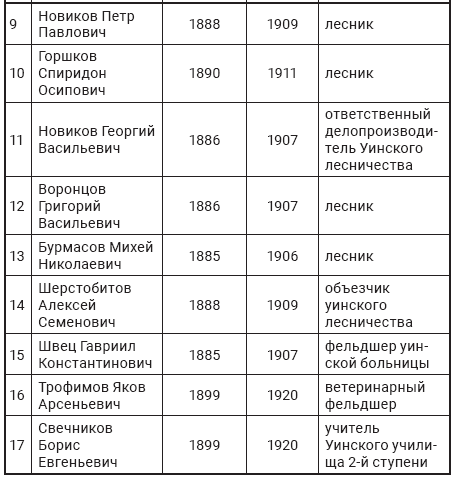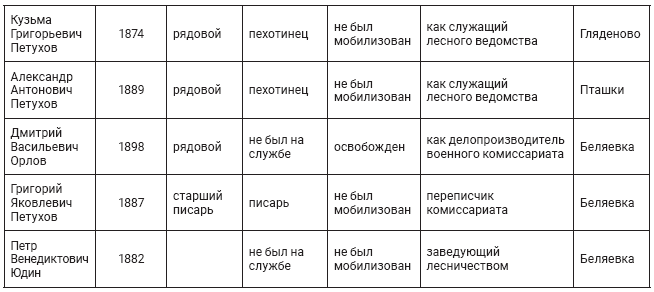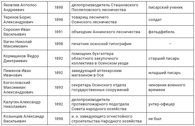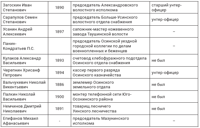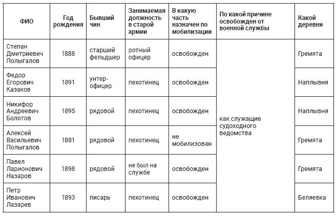 Так, Д.С. Полыгалов, 1888 г. р., житель д. Гремята Беляевской волости Осинского уезда находился в старой армии в качестве ротного офицера. После возвращения работал в судоходстве139. Ф.Е. Казаков, 1891 г. р., д. Наплывня той же волости и уезда, бывший унтер-офицер, по возвращении также работал в судоходстве. Рядовые Н.А. Болотов, 1895 г. р. д. Наплывня, А.В. Полыгалов, 1881 г. р., д. Гремята, К.Г. Петухов, 1874 г. р., д. Гляденово, А.А. Петухов, 1889 г. р., д. Пташки, старший писарь Г.Я. Петухов, 1887 г. р. также находились на разных должностях в гражданских учреждениях140.