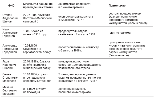 Аспинский волостной исполком составил список должностных лиц, подлежащих мобилизации, которых, по его мнению, следовало от нее освободить145.