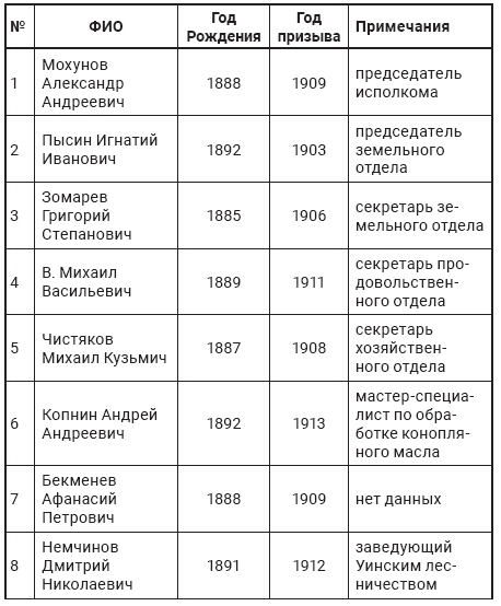 В качестве примера приведем список граждан, подлежавших мобилизации, но оставленных на службе в советских учреждениях Уинской волости Осинского уезда в октябре 1918 г.149