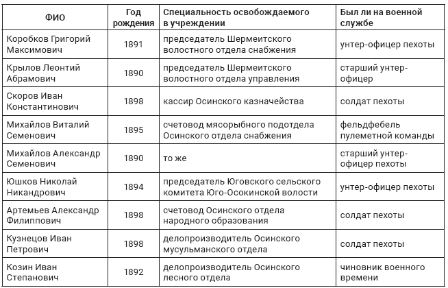 Приведенный выше список в форме таблицы, как и приводимый ниже список лиц, которым были предоставлены отсрочки постановлением Особой комиссии по отсрочкам при Осинском уездном исполкоме, составленный 8 октября 1918 г.150, являются типичными примерами. Подобных списков среди документов военкоматов сохранилось много. Они свидетельствуют прежде всего о большом числе желающих воспользоваться своим служебным положением, чтобы не оказаться на фронте.